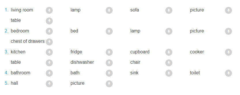 2. Name the things in each room in 1. Use the word list below. (You may use a word more than once.)