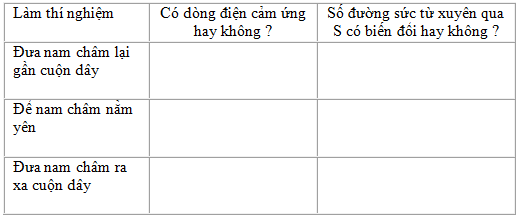 Đối chiếu kết quả thí nghiệm trên với việc khảo sát số đường sức từ xuyên qua tiết diện S của cuộn dây, hãy chọn từ thích hợp cho các ô trống của bảng 1.