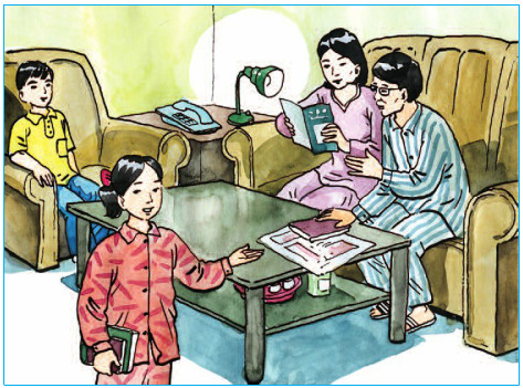 Đây là gia đình tôi. Chúng tôi ở trong phòng khách. Trong gia đình tôi có bốn người. Bố tôi, mẹ tôi, em tôi và tôi. Đây là bố tôi. Ông ấy 40 tuổi. Ông ấy là kĩ sư. Đây là mẹ tôi. Bà ấy 35 tuổi. Bà ấy là giáo viên. Em trai tôi 8 tuổi. Em ấy là học sinh.
