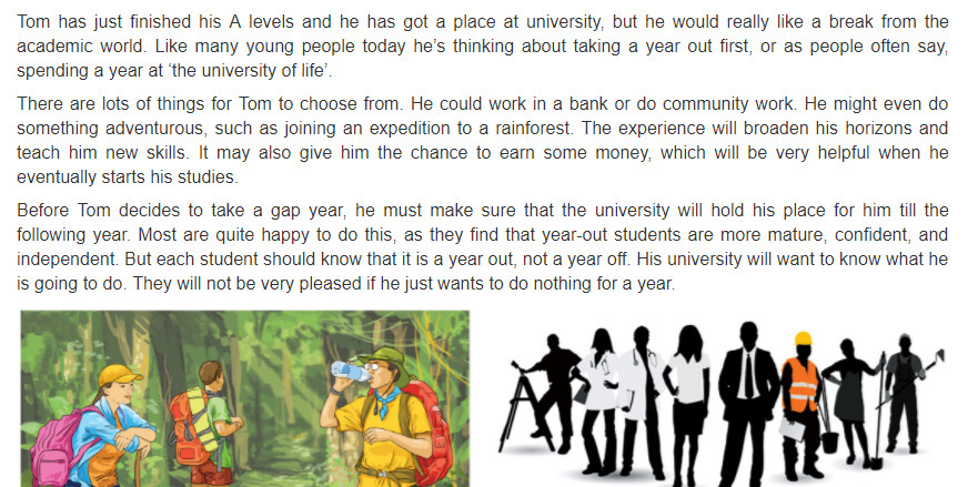 Tom vừa mới hoàn thành trình độ A của mình và giành được 1 suất vào trường đại học, nhưng anh ấy thực sự muốn nghỉ ngơi từ thế giới học thuật . Giống như nhiều người trẻ ngày nay, anh ấy nghĩ đến việc phải mất một năm đầu tiên, hoặc như mọi người thường nói, dành một năm ở 'trường đại học của cuộc đời'.