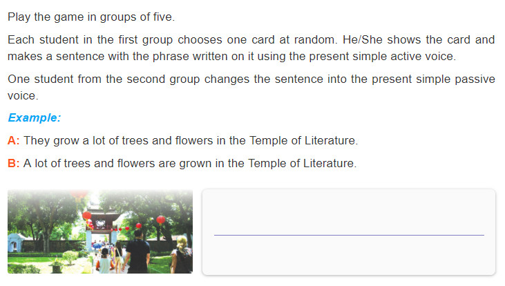 Mỗi học sinh trong nhóm đầu tiên chọn một thẻ ngẫu nhiên. Anh ấy/ cô ấy đưa ra thẻ và tạo thành một câu với cụm từ trên thẻ bằng cách sử dụng thì hiện tại đơn ở dạng thể chủ động.