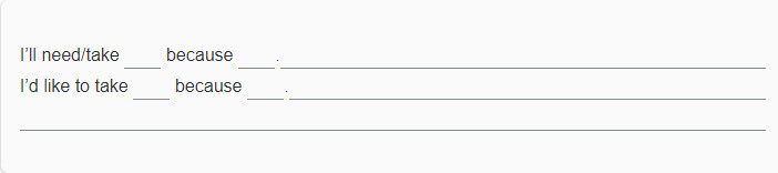 (Làm việc theo cặp. Cho bạn biết về ba món đồ bạn sẽ mang theo cho chuyến đi và giải thích lý do. Bạn có thể sử dụng các đề xuất sau.)