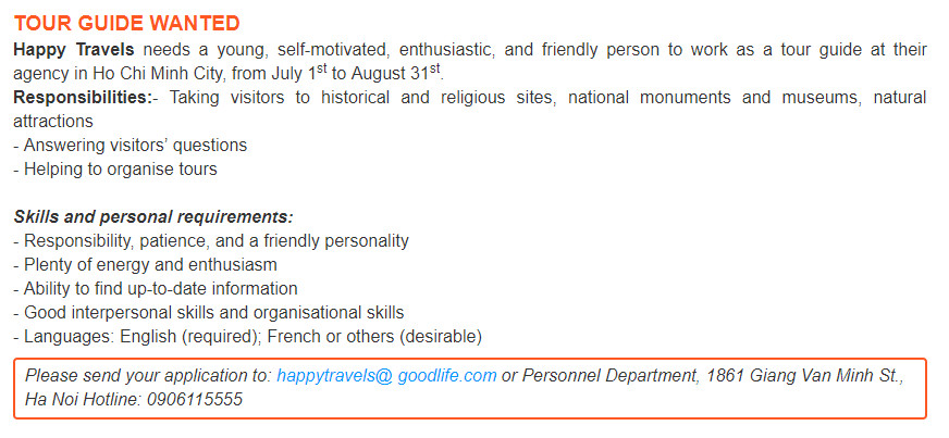 Happy Travels cần một người trẻ, năng động, nhiệt tình và thân thiện để làm việc như một hướng dẫn viên du lịch tại cơ quan ở thành phố Hồ Chí Minh, từ ngày 1 tháng 7 đến ngày 31 tháng 8.