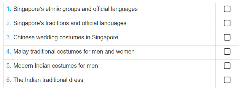 2. Singapore khong có trang phục dân tộc, vì người dân từ các nhóm dân tộc khác nhau có xu hướng mặc quần áo truyền thống.
