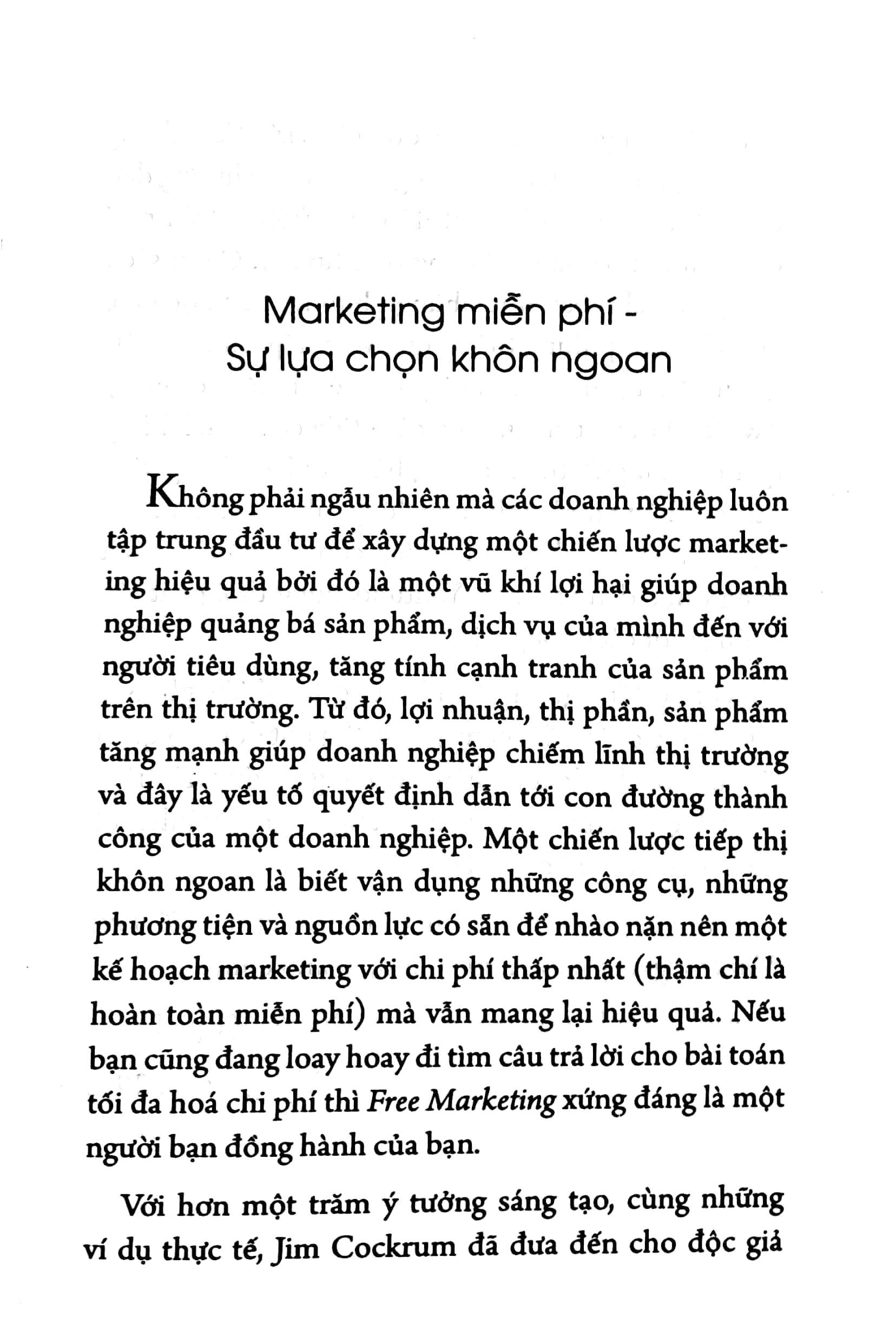 Cuốn sách “Free Marketing – 101 Ý Tưởng Phát Triển Doanh Nghiệp Với Chi Phí Thấp” của tác giả Jim Cockrum đem lại một trải nghiệm đáng giá với những cách tiếp cận mới mẻ và sáng tạo trong lĩnh vực marketing. Điểm mạnh của cuốn sách là việc trình bày một loạt ý tưởng tiết kiệm chi phí mà vẫn đảm bảo hiệu quả trong quảng bá sản phẩm và phát triển doanh nghiệp.
